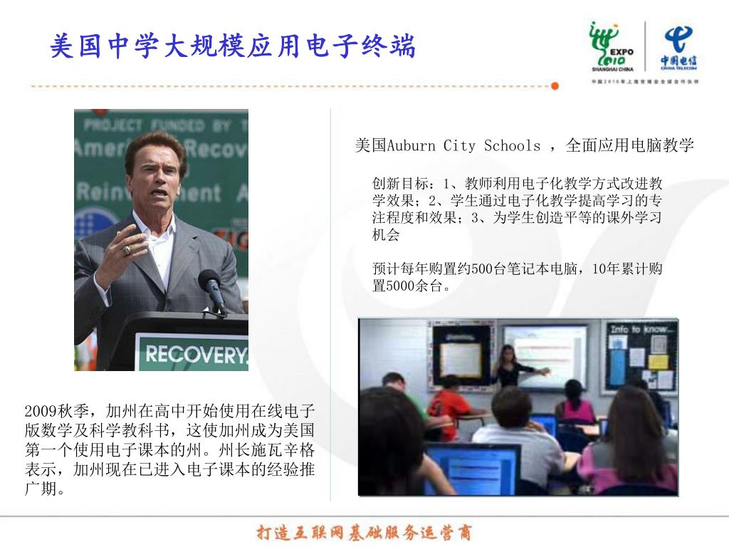 美国中学大规模应用电子终端 美国Auburn City Schools ,全面应用电脑教学 创新目标:1、教师利用电子化教学方式改进教学效果;2、学生通过电子化教学提高学习的专注程度和效果;3、为学生创造平等的课外学习机会 预计每年购置约500台笔记本电脑,10年累计购置5000余台。 2009秋季,加州在高中开始使用在线电子版数学及科学教科书,这使加州成为美国第一个使用电子课本的州。州长施瓦辛格表示,加州现在已进入电子课本的经验推广期。