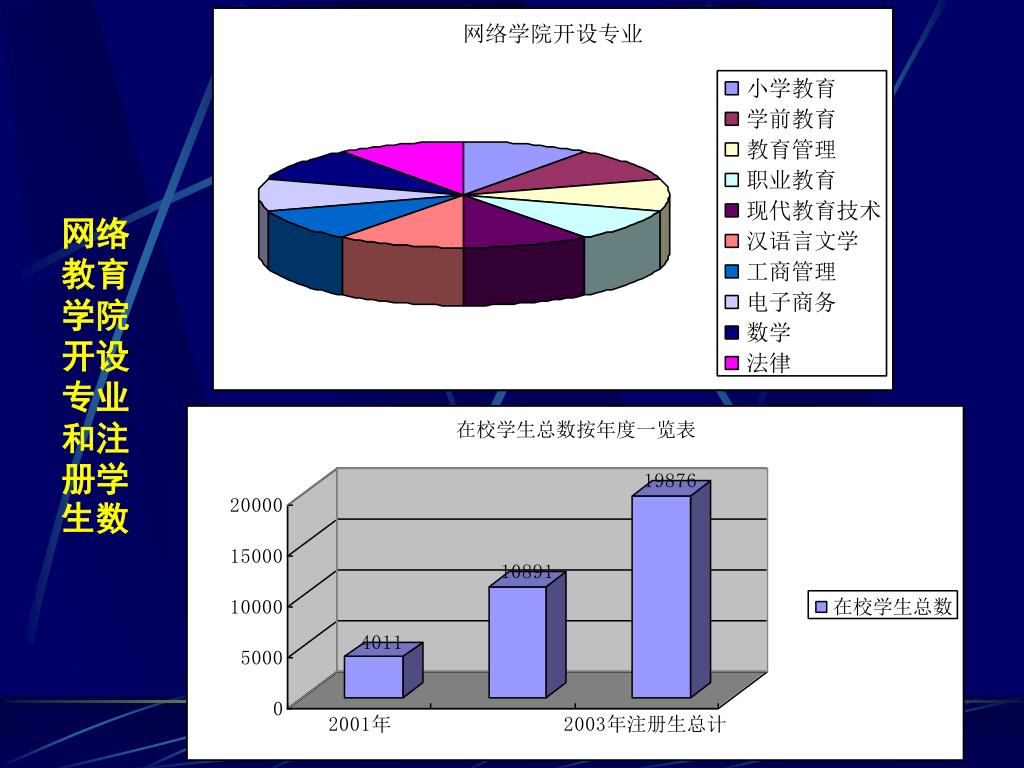 1. 开设专业及招生 截至到2003年底,网络教育学院共开设了涉及高中起点本科、专科升本科两个层次,包括汉语言文学、小学教育(文、理)、学前教育、教育管理、法学、电子商务、工商管理、现代教育技术、职业教育、数学等十个专业。 招生人数逐年增加,截至到2003年底在学学员共19974人,其中在职学员比例为91%。