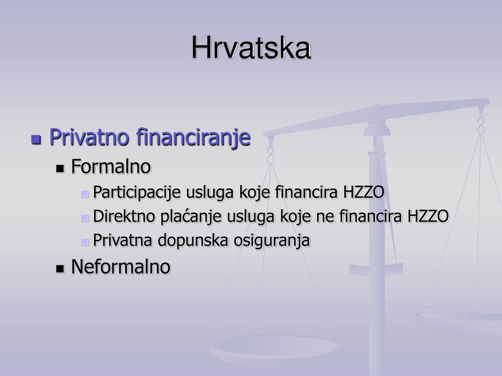 Hrvatska • Privatno financiranje • Formalno • Participacije usluga koje financira HZZO • Direktno plaćanje usluga koje ne financira HZZO • Privatna dopunska osiguranja • Neformalno