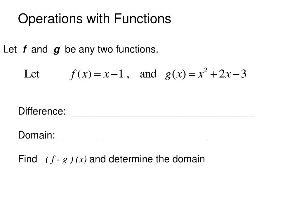 Operations with Functions Let f and g be any two functions. Difference: _________________________________ Domain: ___________________________ Find ( f - g ) (x) and determine the domain