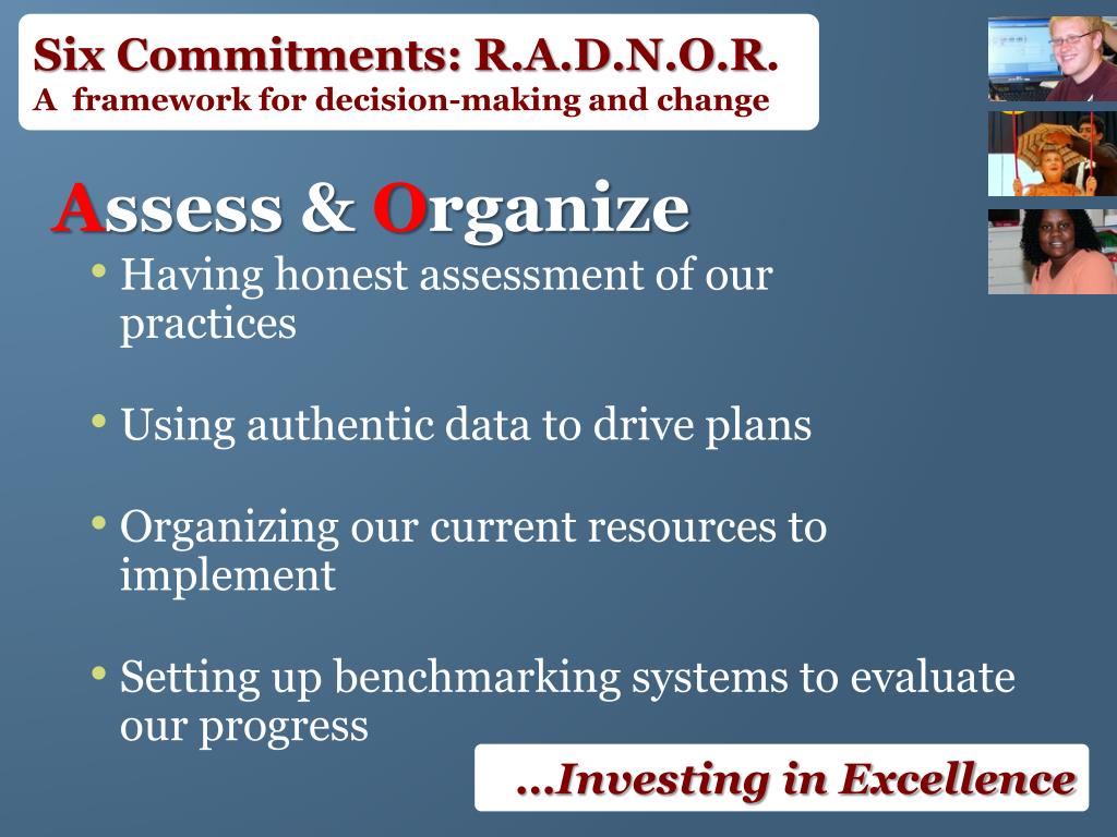 Six Commitments: R.A.D.N.O.R. A framework for decision-making and change Assess & Organize • Having honest assessment of our practices • Using authentic data to drive plans • Organizing our current resources to implement • Setting up benchmarking systems to evaluate our progress