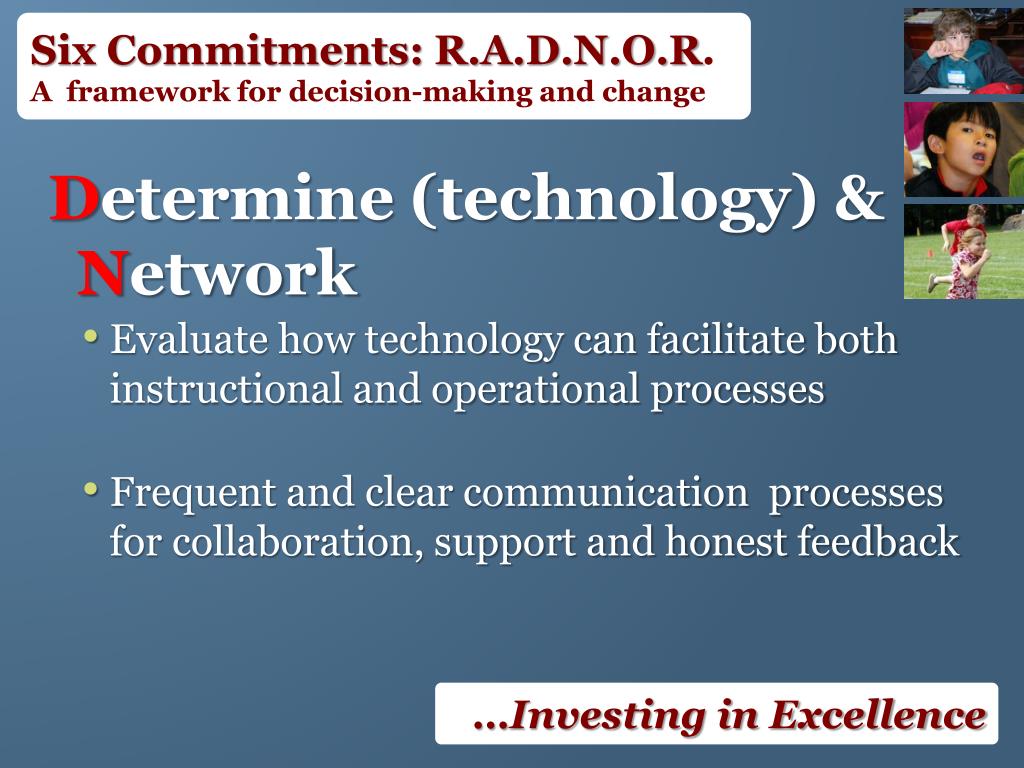 Six Commitments: R.A.D.N.O.R. A framework for decision-making and change Determine (technology) & Network • Evaluate how technology can facilitate both instructional and operational processes • Frequent and clear communication processes for collaboration, support and honest feedback