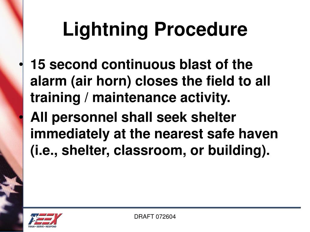Lightning Procedure • 15 second continuous blast of the alarm (air horn) closes the field to all training / maintenance activity. • All personnel shall seek shelter immediately at the nearest safe haven (i.e., shelter, classroom, or building). DRAFT 072604