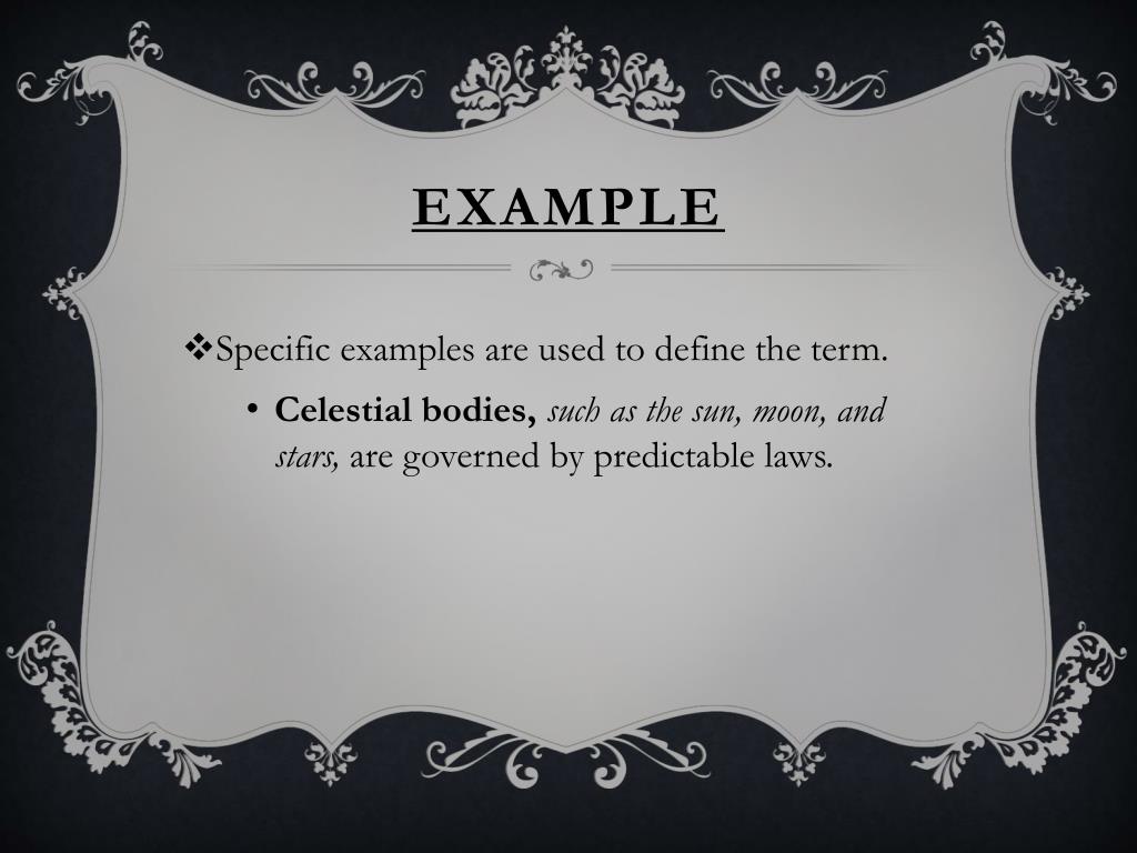 Example • Specific examples are used to define the term. • Celestial bodies, such as the sun, moon, and stars, are governed by predictable laws.