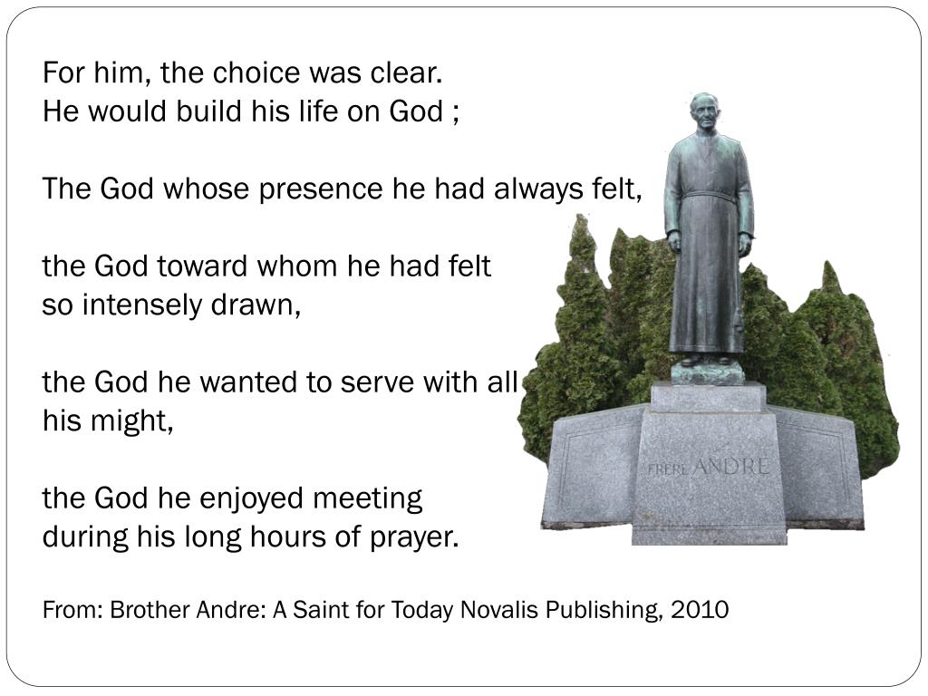 For him, the choice was clear. He would build his life on God ;The God whose presence he had always felt, the God toward whom he had feltso intensely drawn, the God he wanted to serve with all his might, the God he enjoyed meeting during his long hours of prayer. From: Brother Andre: A Saint for Today Novalis Publishing, 2010