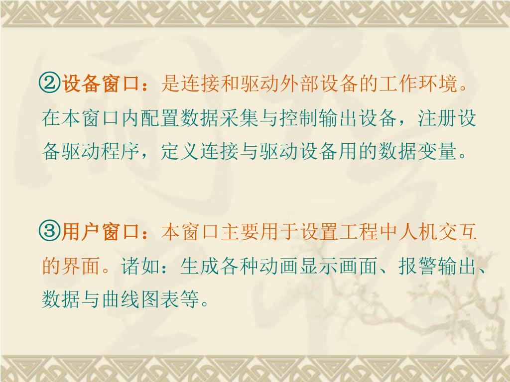 ②设备窗口:是连接和驱动外部设备的工作环境。在本窗口内配置数据采集与控制输出设备,注册设备驱动程序,定义连接与驱动设备用的数据变量。②设备窗口:是连接和驱动外部设备的工作环境。在本窗口内配置数据采集与控制输出设备,注册设备驱动程序,定义连接与驱动设备用的数据变量。 ③用户窗口:本窗口主要用于设置工程中人机交互的界面。诸如:生成各种动画显示画面、报警输出、数据与曲线图表等。