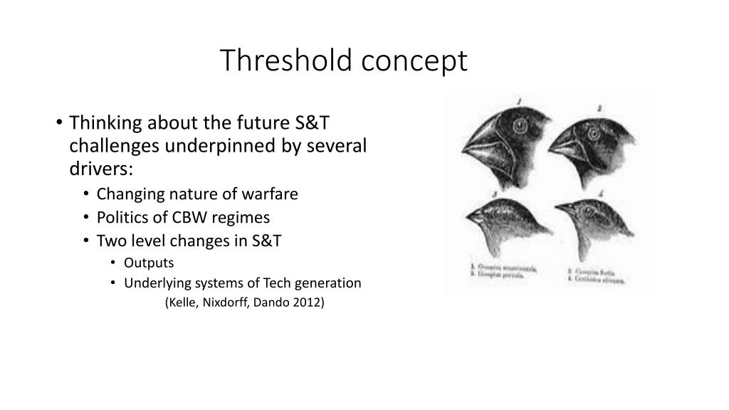 Threshold concept • Thinking about the future S&T challenges underpinned by several drivers: • Changing nature of warfare • Politics of CBW regimes • Two level changes in S&T • Outputs • Underlying systems of Tech generation (Kelle, Nixdorff, Dando 2012)
