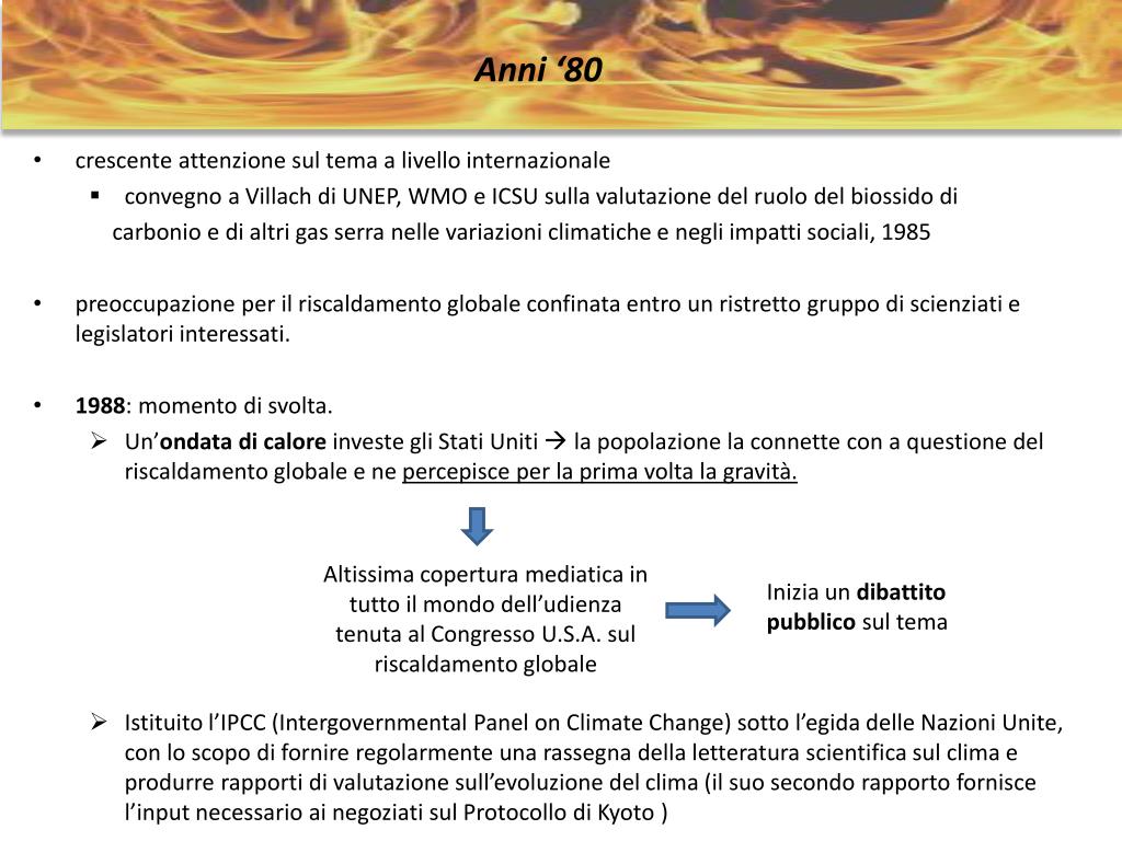 Anni ‘80 • crescente attenzione sul tema a livello internazionale • convegno a Villach di UNEP, WMO e ICSU sulla valutazione del ruolo del biossido di carbonio e di altri gas serra nelle variazioni climatiche e negli impatti sociali, 1985 • preoccupazione per il riscaldamento globale confinata entro un ristretto gruppo di scienziati e legislatori interessati. • 1988: momento di svolta. • Un’ondata di calore investe gli Stati Uniti la popolazione la connette con a questione del riscaldamento globale e ne percepisce per la prima volta la gravità. • Istituito l’IPCC (IntergovernmentalPanel on ClimateChange) sotto l’egida delle Nazioni Unite, con lo scopo di fornire regolarmente una rassegna della letteratura scientifica sul clima e produrre rapporti di valutazione sull’evoluzione del clima (il suo secondo rapporto fornisce l’input necessario ai negoziati sul Protocollo di Kyoto ) Altissima copertura mediatica in tutto il mondo dell’udienza tenuta al Congresso U.S.A. sul riscaldamento globale Inizia un dibattito pubblico sul tema