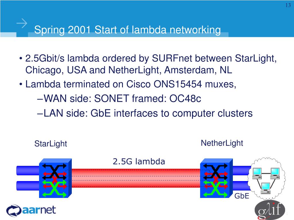 NetherLight StarLight GbE GbE 2.5G lambda GbE Spring 2001 Start of lambda networking • 2.5Gbit/s lambda ordered by SURFnet between StarLight, Chicago, USA and NetherLight, Amsterdam, NL • Lambda terminated on Cisco ONS15454 muxes, • WAN side: SONET framed: OC48c • LAN side: GbE interfaces to computer clusters