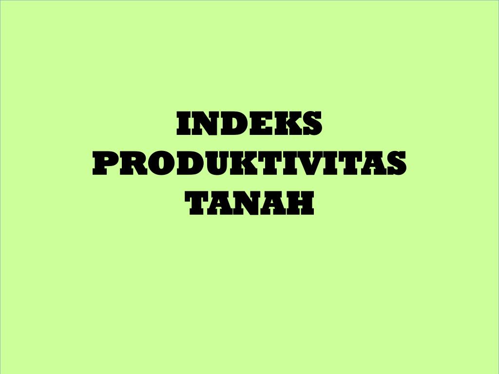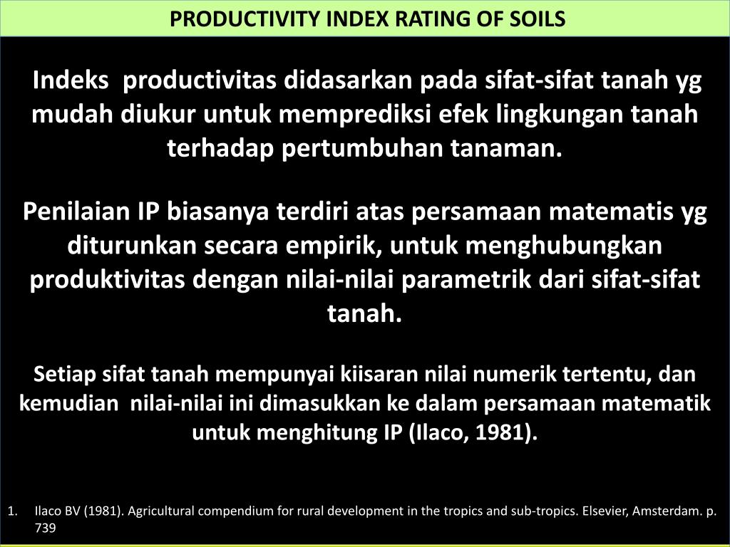 PRODUCTIVITY INDEX RATING OF SOILS Indeksproductivitasdidasarkanpadasifat-sifattanahygmudahdiukuruntukmemprediksiefeklingkungantanahterhadappertumbuhantanaman. Penilaian IP biasanyaterdiriataspersamaanmatematisygditurunkansecaraempirik, untukmenghubungkanproduktivitasdengannilai-nilaiparametrikdarisifat-sifattanah. Setiapsifattanahmempunyaikiisarannilainumeriktertentu, dankemudiannilai-nilaiinidimasukkankedalampersamaanmatematikuntukmenghitung IP (Ilaco, 1981). Ilaco BV (1981). Agricultural compendium for rural development in the tropics and sub-tropics. Elsevier, Amsterdam. p. 739 Sumber: Productivity index rating of some soils in the Tolon/Kumbungu district of the Northern region of Ghana . ImoroAbukariZiblim, Daniel Okai-Anti and E. Augustine Asmah. Journal of Soil Science and Environmental Management Vol. 3(6), pp. 154-163, 2012
