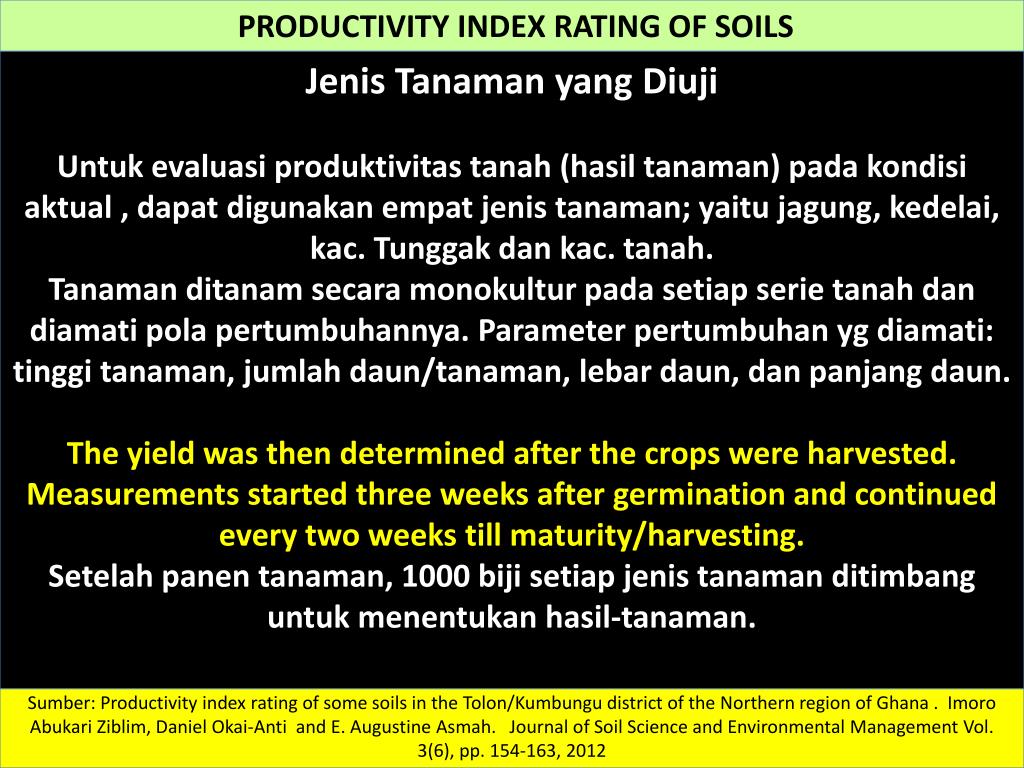 PRODUCTIVITY INDEX RATING OF SOILS JenisTanaman yang Diuji Untukevaluasiproduktivitastanah (hasiltanaman) padakondisiaktual , dapatdigunakanempatjenistanaman; yaitujagung, kedelai, kac. Tunggakdankac. tanah. Tanamanditanamsecaramonokulturpadasetiapserietanahdandiamatipolapertumbuhannya. Parameter pertumbuhanygdiamati: tinggitanaman, jumlahdaun/tanaman, lebardaun, danpanjangdaun. The yield was then determined after the crops were harvested. Measurements started three weeks after germination and continued every two weeks till maturity/harvesting. Setelahpanentanaman, 1000 bijisetiapjenistanamanditimbanguntukmenentukanhasil-tanaman. Sumber: Productivity index rating of some soils in the Tolon/Kumbungu district of the Northern region of Ghana . ImoroAbukariZiblim, Daniel Okai-Anti and E. Augustine Asmah. Journal of Soil Science and Environmental Management Vol. 3(6), pp. 154-163, 2012