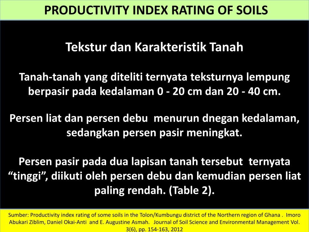 PRODUCTIVITY INDEX RATING OF SOILS Sumber: Productivity index rating of some soils in the Tolon/Kumbungu district of the Northern region of Ghana . ImoroAbukariZiblim, Daniel Okai-Anti and E. Augustine Asmah. Journal of Soil Science and Environmental Management Vol. 3(6), pp. 154-163, 2012