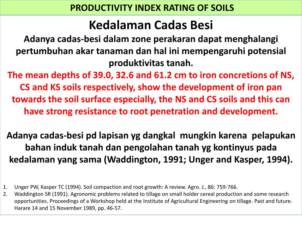 PRODUCTIVITY INDEX RATING OF SOILS KedalamanCadasBesi Adanyacadas-besidalam zone perakarandapatmenghalangipertumbuhanakartanamandanhalinimempengaruhipotensialproduktivitastanah. The mean depths of 39.0, 32.6 and 61.2 cm to iron concretions of NS, CS and KS soils respectively, show the development of iron pan towards the soil surface especially, the NS and CS soils and this can have strong resistance to root penetration and development. Adanyacadas-besi pd lapisanygdangkalmungkinkarenapelapukanbahaninduktanahdanpengolahantanahygkontinyuspadakedalaman yang sama(Waddington, 1991; Unger and Kasper, 1994). Unger PW, Kasper TC (1994). Soil compaction and root growth: A review. Agro. J., 86: 759-766. Waddington SR (1991). Agronomic problems related to tillage on small holder cereal production and some research opportunities. Proceedings of a Workshop held at the Institute of Agricultural Engineering on tillage. Past and future. Harare 14 and 15 November 1989, pp. 46-57.