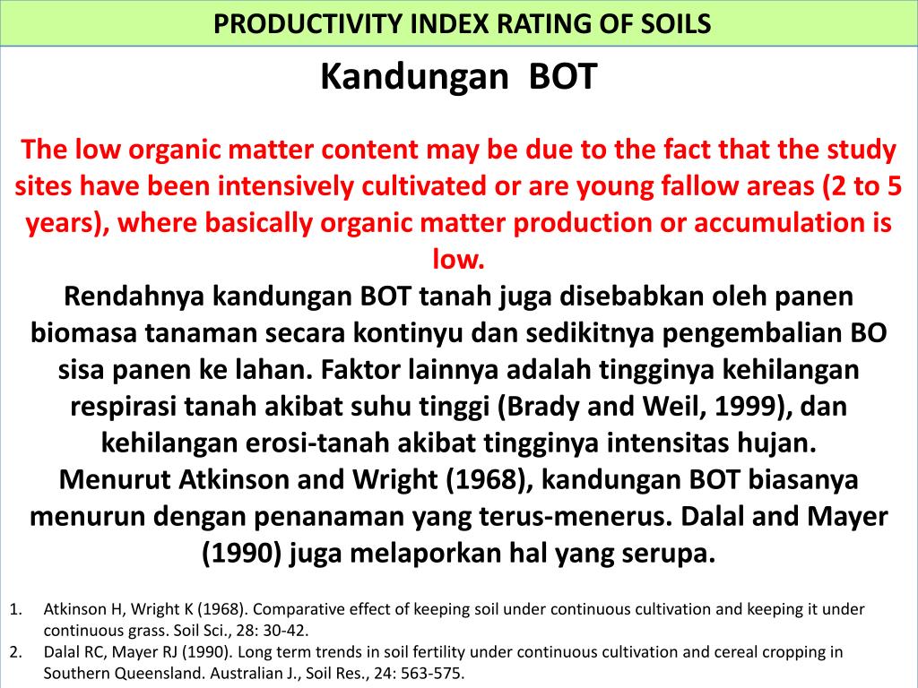 PRODUCTIVITY INDEX RATING OF SOILS Kandungan BOT The low organic matter content may be due to the fact that the study sites have been intensively cultivated or are young fallow areas (2 to 5 years), where basically organic matter production or accumulation is low. Rendahnyakandungan BOT tanahjugadisebabkanolehpanenbiomasatanamansecarakontinyudansedikitnyapengembalian BO sisapanenkelahan. Faktorlainnyaadalahtingginyakehilanganrespirasitanahakibatsuhutinggi (Brady and Weil, 1999), dankehilanganerosi-tanahakibattingginyaintensitashujan. Menurut Atkinson and Wright (1968), kandungan BOT biasanyamenurundenganpenanaman yang terus-menerus. Dalal and Mayer (1990) jugamelaporkanhal yang serupa. Atkinson H, Wright K (1968). Comparative effect of keeping soil under continuous cultivation and keeping it under continuous grass. Soil Sci., 28: 30-42. Dalal RC, Mayer RJ (1990). Long term trends in soil fertility under continuous cultivation and cereal cropping in Southern Queensland. Australian J., Soil Res., 24: 563-575.