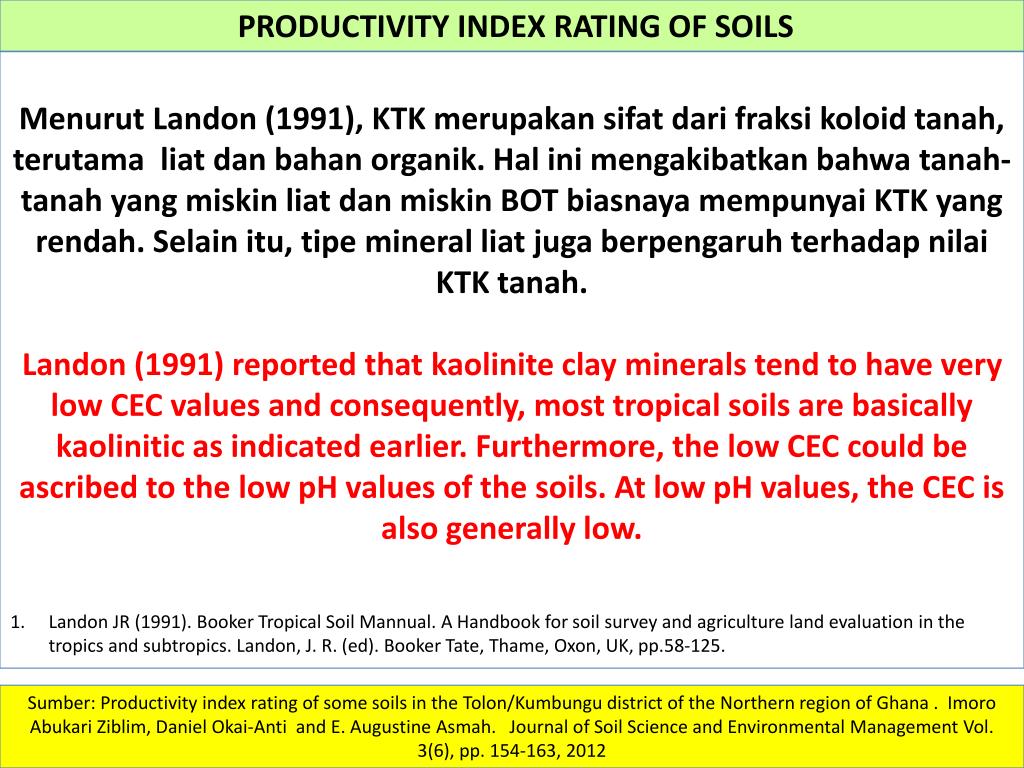 PRODUCTIVITY INDEX RATING OF SOILS Menurut Landon (1991), KTK merupakansifatdarifraksikoloidtanah, terutamaliatdanbahanorganik. Hal inimengakibatkanbahwatanah-tanah yang miskinliatdanmiskin BOT biasnayamempunyai KTK yang rendah. Selainitu, tipe mineral liatjugaberpengaruhterhadapnilai KTK tanah. Landon (1991) reported that kaolinite clay minerals tend to have very low CEC values and consequently, most tropical soils are basically kaolinitic as indicated earlier. Furthermore, the low CEC could be ascribed to the low pH values of the soils. At low pH values, the CEC is also generally low. Landon JR (1991). Booker Tropical Soil Mannual. A Handbook for soil survey and agriculture land evaluation in the tropics and subtropics. Landon, J. R. (ed). Booker Tate, Thame, Oxon, UK, pp.58-125. Sumber: Productivity index rating of some soils in the Tolon/Kumbungu district of the Northern region of Ghana . ImoroAbukariZiblim, Daniel Okai-Anti and E. Augustine Asmah. Journal of Soil Science and Environmental Management Vol. 3(6), pp. 154-163, 2012