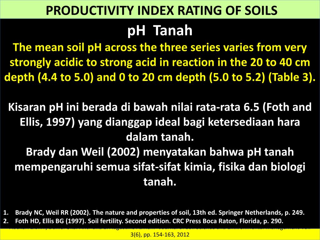 PRODUCTIVITY INDEX RATING OF SOILS pH Tanah The mean soil pH across the three series varies from very strongly acidic to strong acid in reaction in the 20 to 40 cm depth (4.4 to 5.0) and 0 to 20 cm depth (5.0 to 5.2) (Table 3). Kisaran pH iniberadadibawahnilai rata-rata 6.5 (Foth and Ellis, 1997) yang dianggap ideal bagiketersediaanharadalamtanah. Brady danWeil (2002) menyatakanbahwa pH tanahmempengaruhisemuasifat-sifatkimia, fisikadanbiologitanah. Brady NC, Weil RR (2002). The nature and properties of soil, 13th ed. Springer Netherlands, p. 249. Foth HD, Ellis BG (1997). Soil fertility. Second edition. CRC Press Boca Raton, Florida, p. 290. Sumber: Productivity index rating of some soils in the Tolon/Kumbungu district of the Northern region of Ghana . ImoroAbukariZiblim, Daniel Okai-Anti and E. Augustine Asmah. Journal of Soil Science and Environmental Management Vol. 3(6), pp. 154-163, 2012