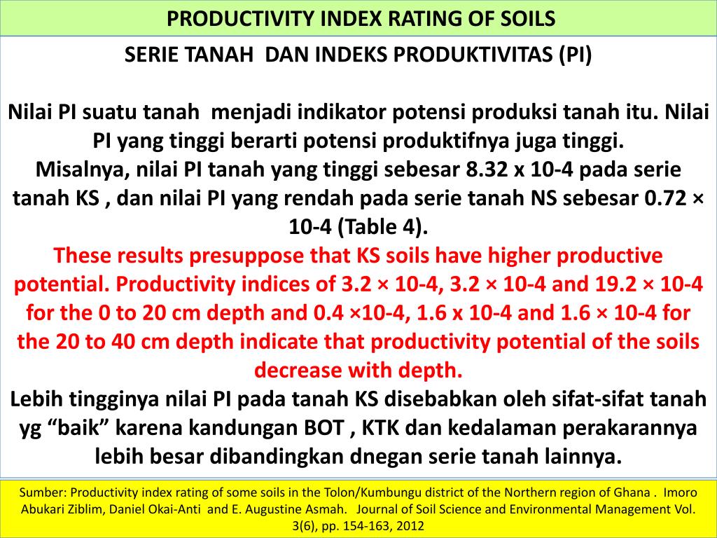 PRODUCTIVITY INDEX RATING OF SOILS Seri tanah KS mempunyainilai PI lebihtinggi, sedengkanseritanah NS nenounyainilai PI paling rendah. This might mean that KS has higher productivity potential than both CS and NS. All three soil series showed low current suitability for crop production, however, given prudent soil management practices, the soils would be potentially suitable for crop production. Direkomendasikanpengelolaantanahdilakukanuntukmemperbaiki pH tanahdanmemasukkanbahanorganikuntukmeningkatkanproduktivitasnya. Sumber: Productivity index rating of some soils in the Tolon/Kumbungu district of the Northern region of Ghana . ImoroAbukariZiblim, Daniel Okai-Anti and E. Augustine Asmah. Journal of Soil Science and Environmental Management Vol. 3(6), pp. 154-163, 2012