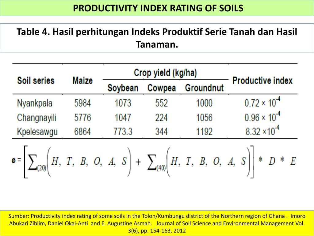 PRODUCTIVITY INDEX RATING OF SOILS Table 4. HasilperhitunganIndeksProduktifSerie Tanah danHasilTanaman. Sumber: Productivity index rating of some soils in the Tolon/Kumbungu district of the Northern region of Ghana . ImoroAbukariZiblim, Daniel Okai-Anti and E. Augustine Asmah. Journal of Soil Science and Environmental Management Vol. 3(6), pp. 154-163, 2012
