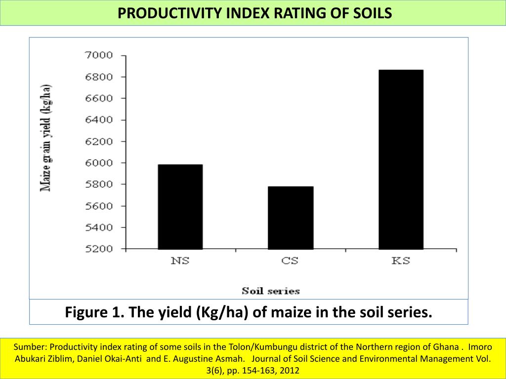 PRODUCTIVITY INDEX RATING OF SOILS Figure 1. The yield (Kg/ha) of maize in the soil series. Sumber: Productivity index rating of some soils in the Tolon/Kumbungu district of the Northern region of Ghana . ImoroAbukariZiblim, Daniel Okai-Anti and E. Augustine Asmah. Journal of Soil Science and Environmental Management Vol. 3(6), pp. 154-163, 2012
