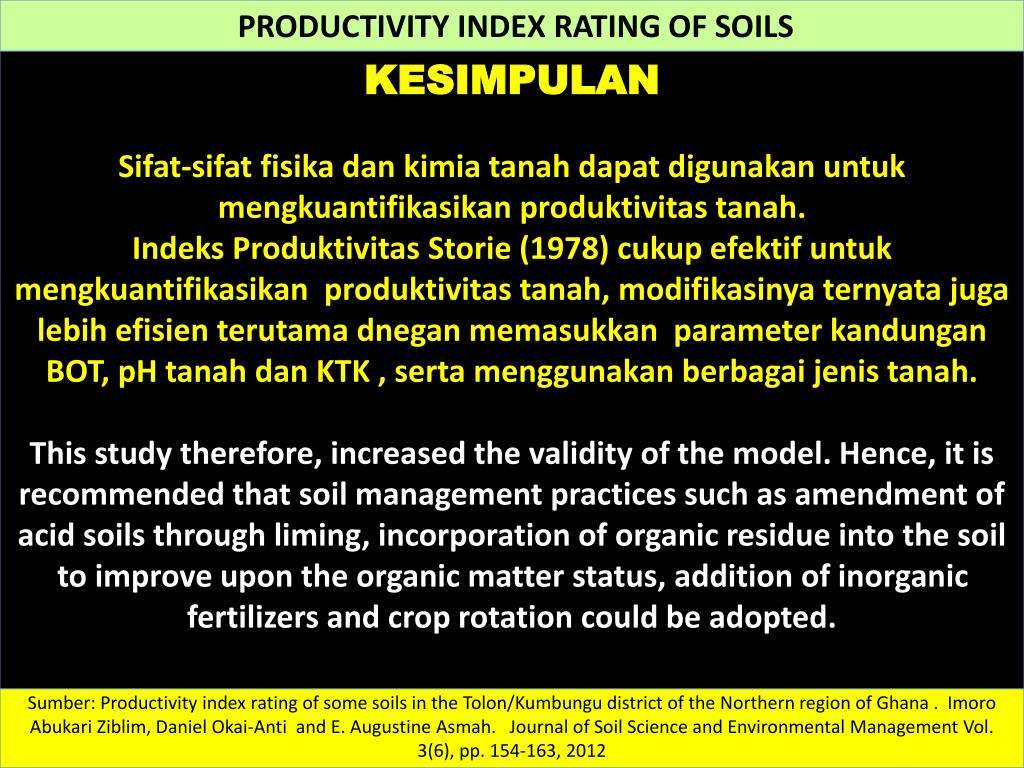 PRODUCTIVITY INDEX RATING OF SOILS KESIMPULAN Sifat-sifatfisikadankimiatanahdapatdigunakanuntukmengkuantifikasikanproduktivitastanah. IndeksProduktivitasStorie (1978) cukupefektifuntukmengkuantifikasikanproduktivitastanah, modifikasinyaternyatajugalebihefisienterutamadneganmemasukkan parameter kandungan BOT, pH tanahdan KTK , sertamenggunakanberbagaijenistanah. This study therefore, increased the validity of the model. Hence, it is recommended that soil management practices such as amendment of acid soils through liming, incorporation of organic residue into the soil to improve upon the organic matter status, addition of inorganic fertilizers and crop rotation could be adopted. Sumber: Productivity index rating of some soils in the Tolon/Kumbungu district of the Northern region of Ghana . ImoroAbukariZiblim, Daniel Okai-Anti and E. Augustine Asmah. Journal of Soil Science and Environmental Management Vol. 3(6), pp. 154-163, 2012