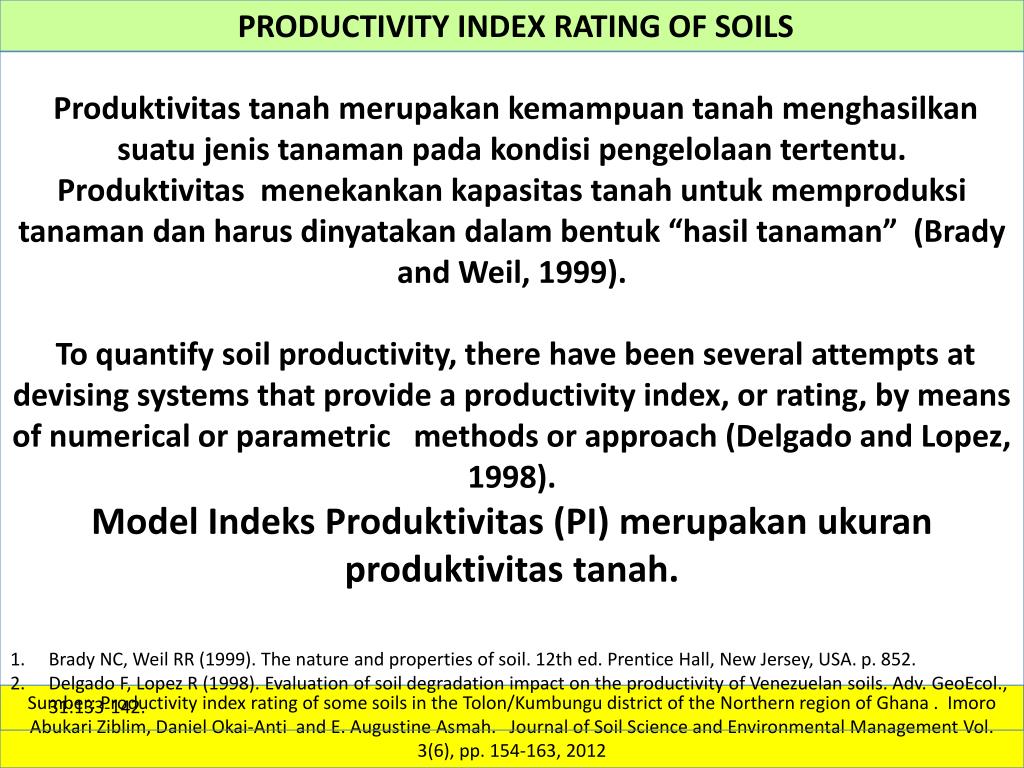 PRODUCTIVITY INDEX RATING OF SOILS Produktivitastanahmerupakankemampuantanahmenghasilkansuatujenistanamanpadakondisipengelolaantertentu. Produktivitasmenekankankapasitastanahuntukmemproduksitanamandanharusdinyatakandalambentuk “hasiltanaman” (Brady and Weil, 1999). To quantify soil productivity, there have been several attempts at devising systems that provide a productivity index, or rating, by means of numerical or parametric methods or approach (Delgado and Lopez, 1998). Model IndeksProduktivitas (PI) merupakanukuranproduktivitastanah. Brady NC, Weil RR (1999). The nature and properties of soil. 12th ed. Prentice Hall, New Jersey, USA. p. 852. Delgado F, Lopez R (1998). Evaluation of soil degradation impact on the productivity of Venezuelan soils. Adv. GeoEcol., 31:133-142. Sumber: Productivity index rating of some soils in the Tolon/Kumbungu district of the Northern region of Ghana . ImoroAbukariZiblim, Daniel Okai-Anti and E. Augustine Asmah. Journal of Soil Science and Environmental Management Vol. 3(6), pp. 154-163, 2012