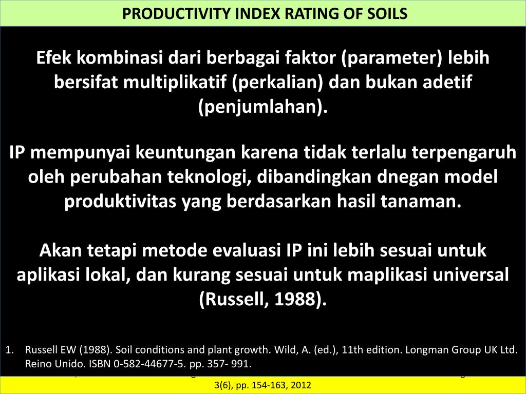 PRODUCTIVITY INDEX RATING OF SOILS Efekkombinasidariberbagaifaktor (parameter) lebihbersifatmultiplikatif (perkalian) danbukanadetif (penjumlahan). IP mempunyaikeuntungankarenatidakterlaluterpengaruholehperubahanteknologi, dibandingkandnegan model produktivitas yang berdasarkanhasiltanaman. Akantetapimetodeevaluasi IP inilebihsesuaiuntukaplikasilokal, dankurangsesuaiuntukmaplikasi universal (Russell, 1988). Russell EW (1988). Soil conditions and plant growth. Wild, A. (ed.), 11th edition. Longman Group UK Ltd. ReinoUnido. ISBN 0-582-44677-5. pp. 357- 991. Sumber: Productivity index rating of some soils in the Tolon/Kumbungu district of the Northern region of Ghana . ImoroAbukariZiblim, Daniel Okai-Anti and E. Augustine Asmah. Journal of Soil Science and Environmental Management Vol. 3(6), pp. 154-163, 2012