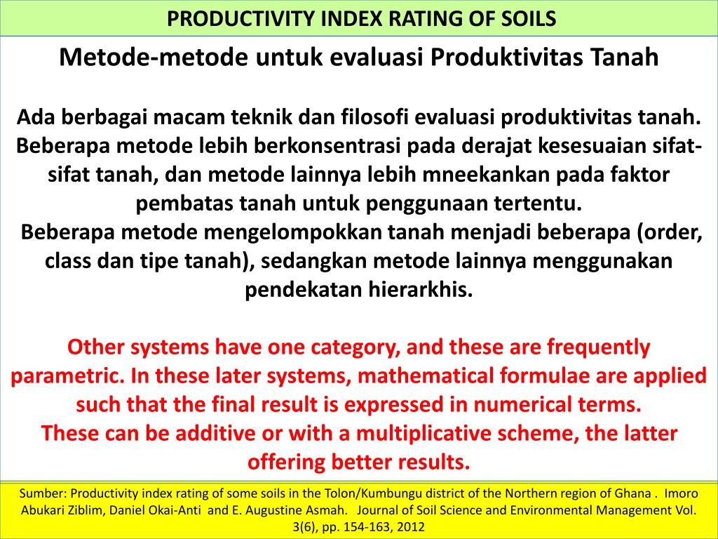 PRODUCTIVITY INDEX RATING OF SOILS Metode-metodeuntukevaluasiProduktivitas Tanah Adaberbagaimacamteknikdanfilosofievaluasiproduktivitastanah. Beberapametodelebihberkonsentrasipadaderajatkesesuaiansifat-sifattanah, danmetodelainnyalebihmneekankanpadafaktorpembatastanahuntukpenggunaantertentu. Beberapametodemengelompokkantanahmenjadibeberapa (order, class dantipetanah), sedangkanmetodelainnyamenggunakanpendekatanhierarkhis. Other systems have one category, and these are frequently parametric. In these later systems, mathematical formulae are applied such that the final result is expressed in numerical terms. These can be additive or with a multiplicative scheme, the latter offering better results. Sumber: Productivity index rating of some soils in the Tolon/Kumbungu district of the Northern region of Ghana . ImoroAbukariZiblim, Daniel Okai-Anti and E. Augustine Asmah. Journal of Soil Science and Environmental Management Vol. 3(6), pp. 154-163, 2012