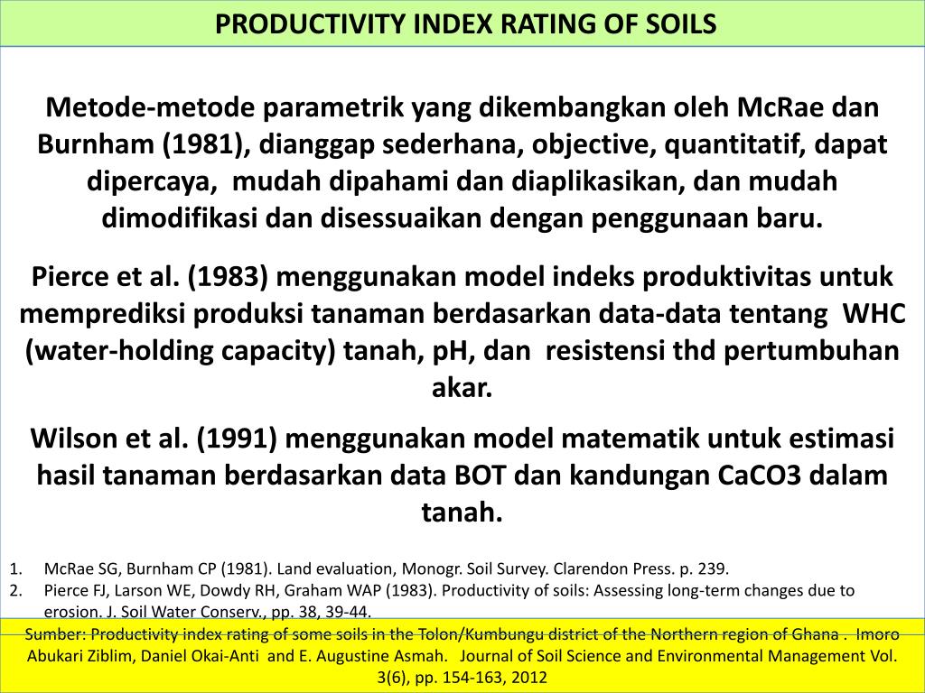 PRODUCTIVITY INDEX RATING OF SOILS Metode-metodeparametrik yang dikembangkanoleh McRae danBurnham (1981), dianggapsederhana, objective, quantitatif, dapatdipercaya, mudahdipahamidandiaplikasikan, danmudahdimodifikasidandisessuaikandenganpenggunaanbaru. Pierce et al. (1983) menggunakan model indeksproduktivitasuntukmemprediksiproduksitanamanberdasarkan data-data tentang WHC (water-holding capacity) tanah, pH, danresistensithdpertumbuhanakar. Wilson et al. (1991) menggunakan model matematikuntukestimasihasiltanamanberdasarkan data BOT dankandungan CaCO3 dalamtanah. McRae SG, Burnham CP (1981). Land evaluation, Monogr. Soil Survey. Clarendon Press. p. 239. Pierce FJ, Larson WE, Dowdy RH, Graham WAP (1983). Productivity of soils: Assessing long-term changes due to erosion. J. Soil Water Conserv., pp. 38, 39-44. Sumber: Productivity index rating of some soils in the Tolon/Kumbungu district of the Northern region of Ghana . ImoroAbukariZiblim, Daniel Okai-Anti and E. Augustine Asmah. Journal of Soil Science and Environmental Management Vol. 3(6), pp. 154-163, 2012