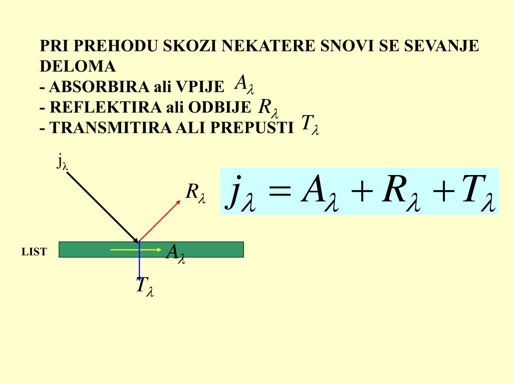 PRI PREHODU SKOZI NEKATERE SNOVI SE SEVANJE DELOMA - ABSORBIRA ali VPIJE - REFLEKTIRA ali ODBIJE - TRANSMITIRA ALI PREPUSTI jλ LIST