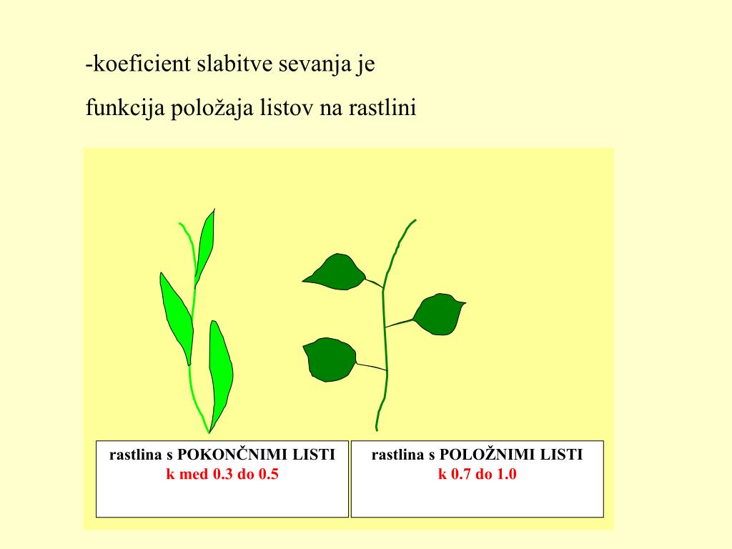 rastlina s POKONČNIMI LISTI k med 0.3 do 0.5 rastlina s POLOŽNIMI LISTI k 0.7 do 1.0 -koeficient slabitve sevanja je funkcija položaja listov na rastlini