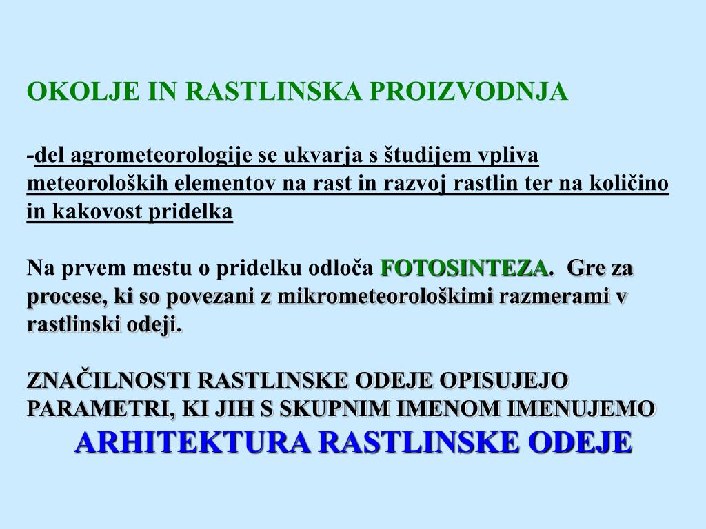 VAJA: ARHITEKTURA RASTLINSKE ODEJE SLABITEV SEVANJA V RASTLINSKI ODEJI. OKOLJE IN RASTLINSKA PROIZVODNJA - del agrometeorologije se ukvarja s študijem vpliva meteoroloških elementov na rast in razvoj rastlin ter na količino in kakovost pridelka