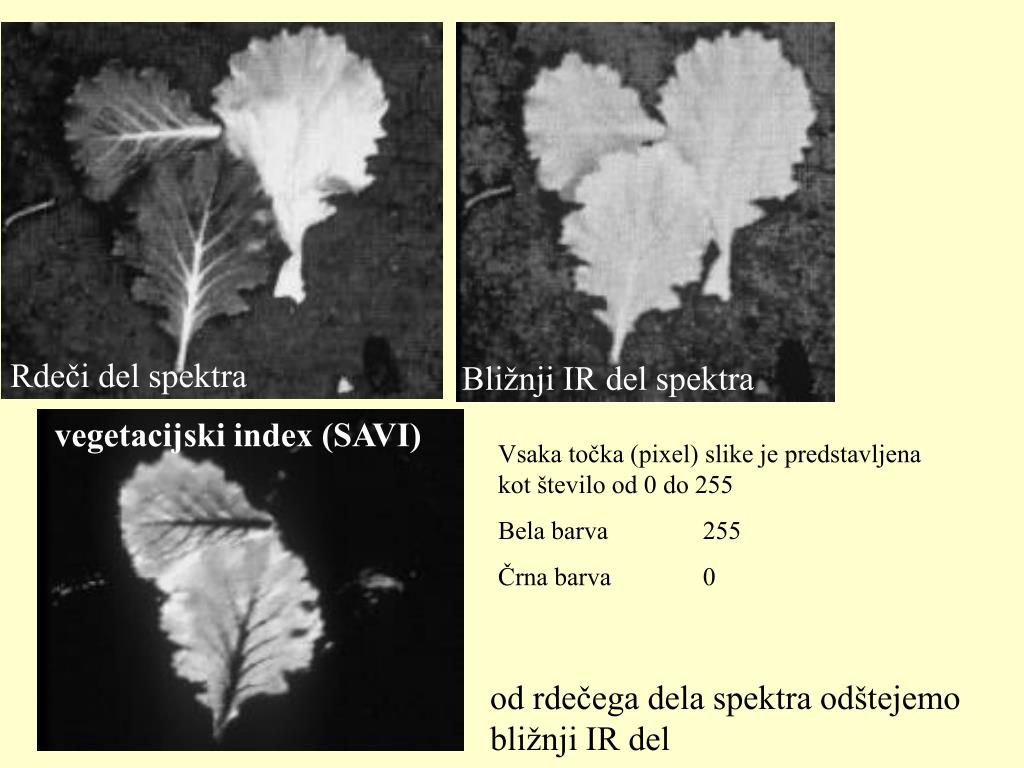 Rdeči del spektra Bližnji IR del spektra vegetacijski index (SAVI) Vsaka točka (pixel) slike je predstavljena kot število od 0 do 255 Bela barva 255 Črna barva 0 od rdečega dela spektra odštejemo bližnji IR del