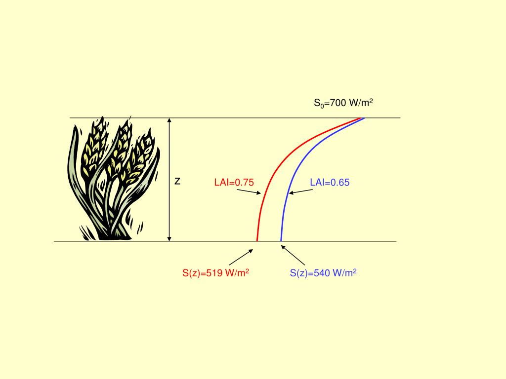 S0=700 W/m2 z LAI=0.75 LAI=0.65 S(z)=519 W/m2 S(z)=540 W/m2