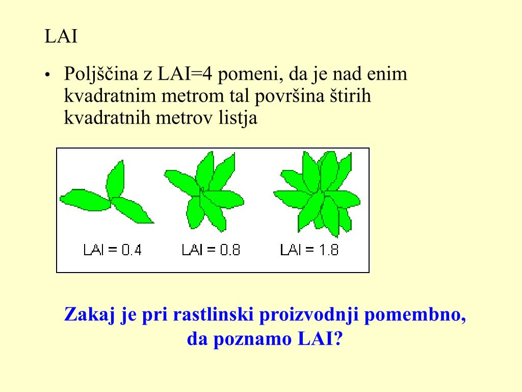 LAI • Poljščina z LAI=4 pomeni, da je nad enim kvadratnim metrom tal površina štirih kvadratnih metrov listja Zakaj je pri rastlinski proizvodnji pomembno, da poznamo LAI?