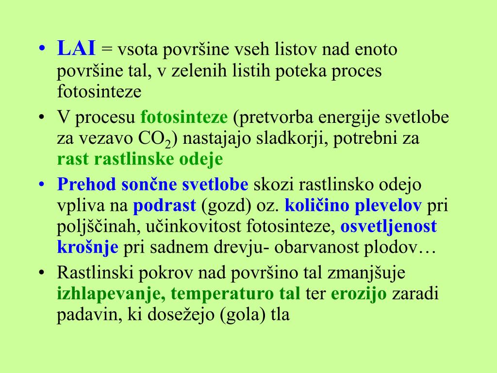 LAI = vsota površine vseh listov nad enoto površine tal, v zelenih listih poteka proces fotosinteze • V procesu fotosinteze (pretvorba energije svetlobe za vezavo CO2)nastajajo sladkorji, potrebni za rast rastlinske odeje • Prehod sončne svetlobe skozi rastlinsko odejo vpliva na podrast (gozd) oz. količino plevelov pri poljščinah, učinkovitost fotosinteze, osvetljenostkrošnje pri sadnem drevju- obarvanost plodov… • Rastlinski pokrov nad površino tal zmanjšuje izhlapevanje, temperaturo taltererozijo zaradi padavin, ki dosežejo (gola) tla