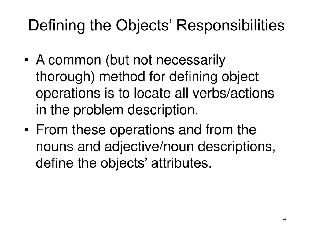 Defining the Objects’ Responsibilities • A common (but not necessarily thorough) method for defining object operations is to locate all verbs/actions in the problem description. • From these operations and from the nouns and adjective/noun descriptions, define the objects’ attributes.
