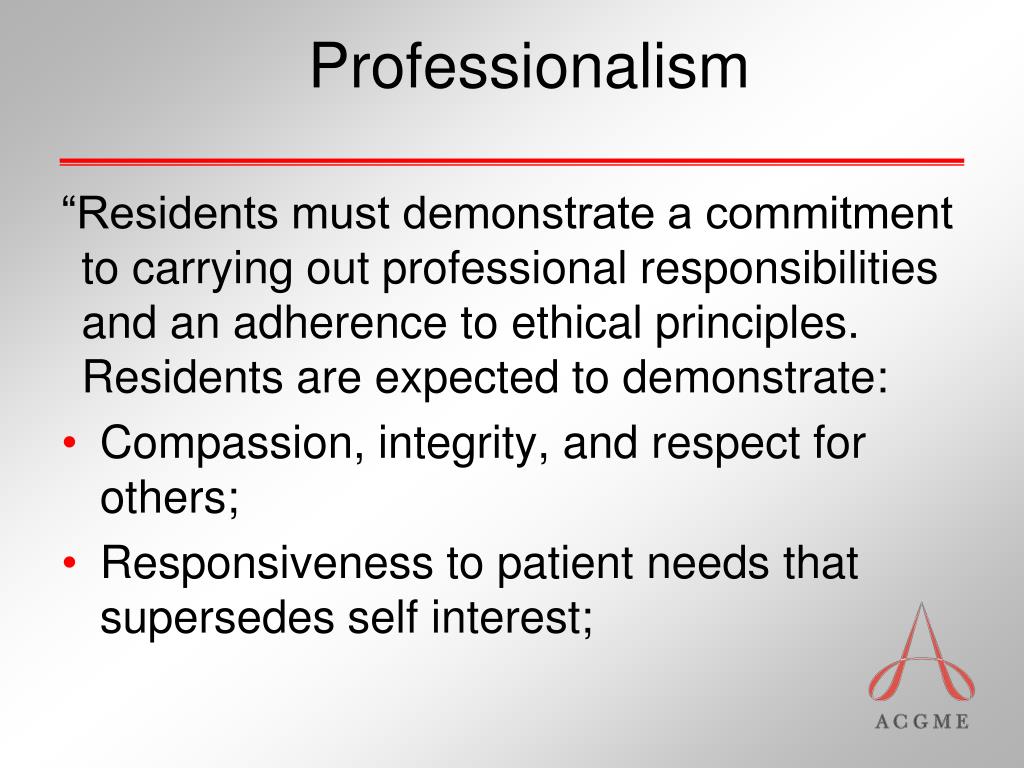 Professionalism “Residents must demonstrate a commitment to carrying out professional responsibilities and an adherence to ethical principles. Residents are expected to demonstrate: • Compassion, integrity, and respect for others; • Responsiveness to patient needs that supersedes self interest;