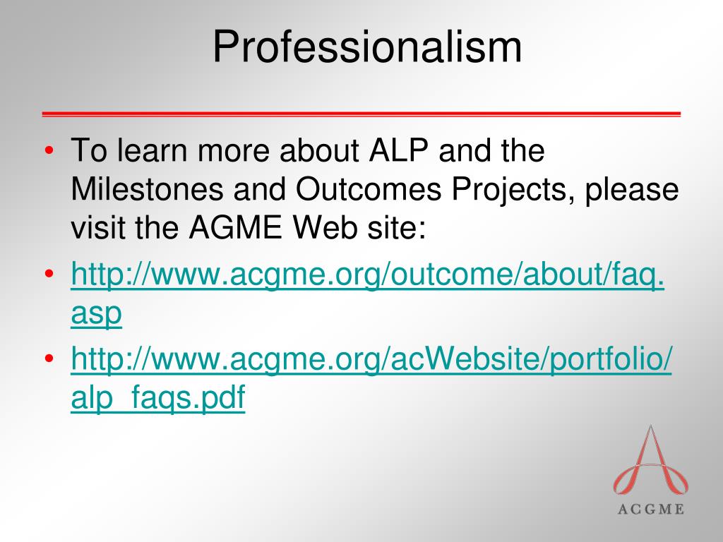 Professionalism • To learn more about ALP and the Milestones and Outcomes Projects, please visit the AGME Web site: • http://www.acgme.org/outcome/about/faq.asp • http://www.acgme.org/acWebsite/portfolio/alp_faqs.pdf