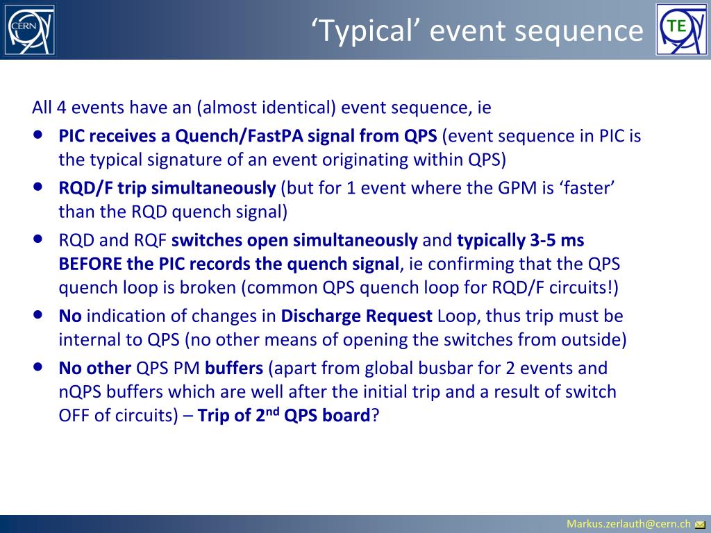 All 4 events have an (almost identical) event sequence, ie PIC receives a Quench/FastPA signal from QPS (event sequence in PIC is the typical signature of an event originating within QPS) RQD/F trip simultaneously (but for 1 event where the GPM is ‘faster’ than the RQD quench signal) RQD and RQF switches open simultaneously and typically 3-5 ms BEFORE the PIC records the quench signal, ie confirming that the QPS quench loop is broken (common QPS quench loop for RQD/F circuits!) No indication of changes in DischargeRequest Loop, thus trip must be internal to QPS (no other means of opening the switches from outside) No other QPS PM buffers (apart from global busbar for 2 events and nQPS buffers which are well after the initial trip and a result of switch OFF of circuits) – Trip of 2nd QPS board? ‘Typical’ event sequence