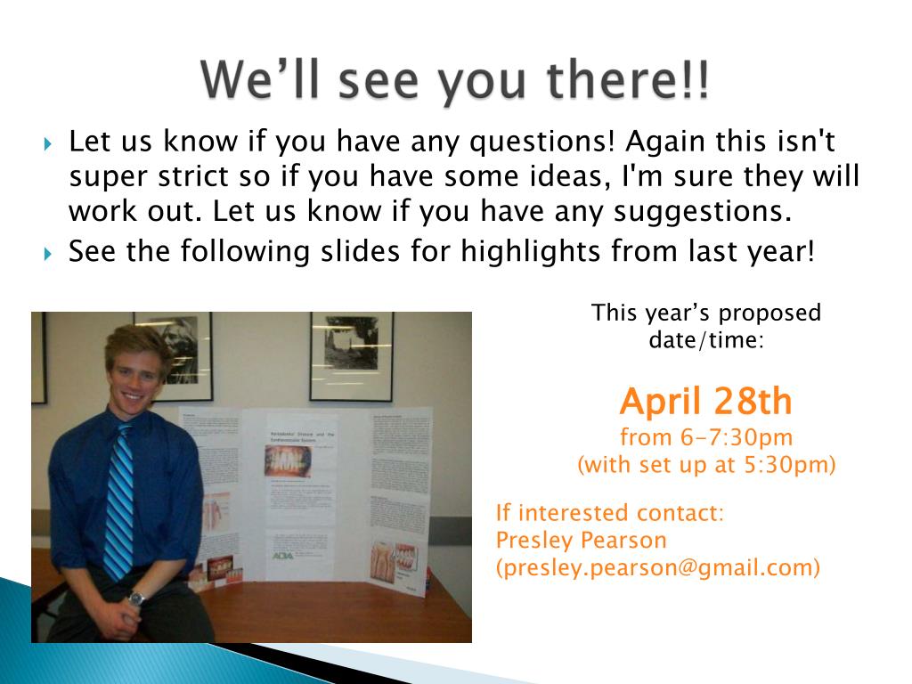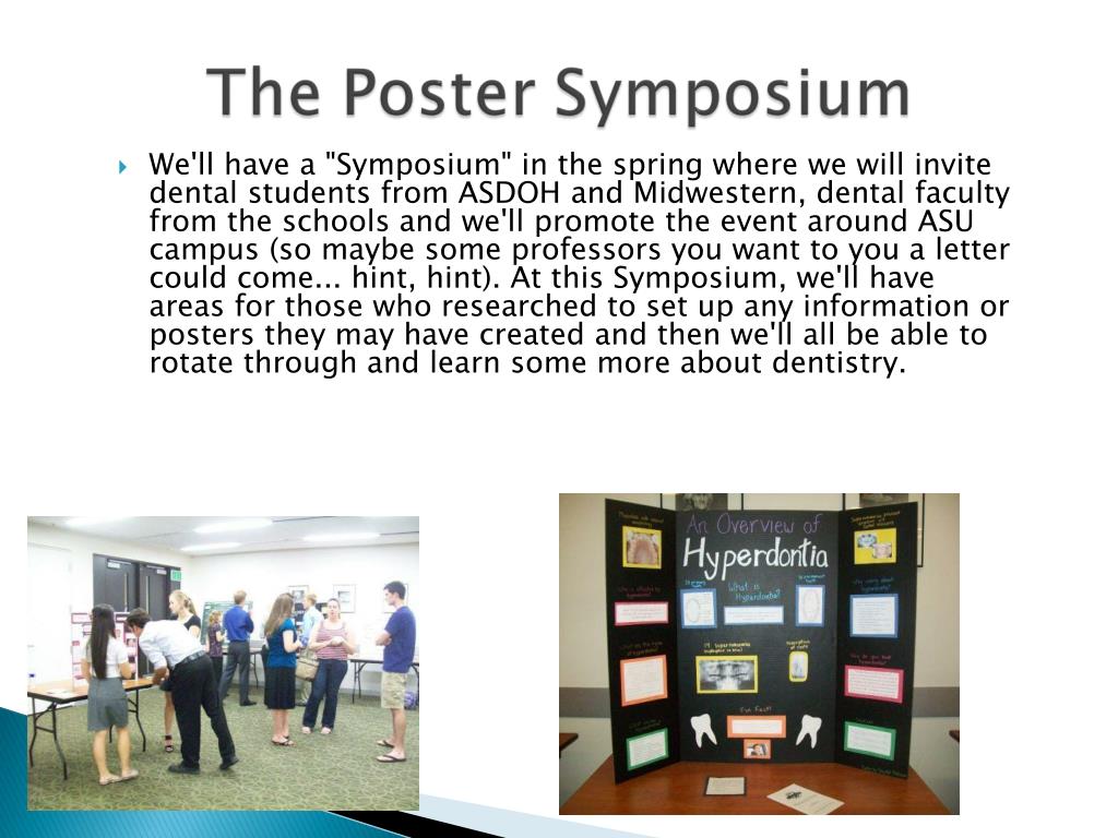 We'll have a "Symposium" in the spring where we will invite dental students from ASDOH and Midwestern, dental faculty from the schools and we'll promote the event around ASU campus (so maybe some professors you want to you a letter could come... hint, hint). At this Symposium, we'll have areas for those who researched to set up any information or posters they may have created and then we'll all be able to rotate through and learn some more about dentistry.