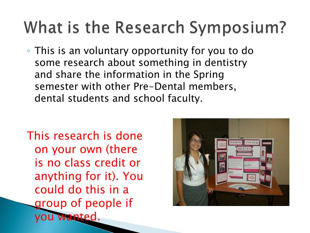 This research is done on your own (there is no class credit or anything for it). You could do this in a group of people if you wanted. • This is an voluntary opportunity for you to do some research about something in dentistry and share the information in the Spring semester with other Pre-Dental members, dental students and school faculty.