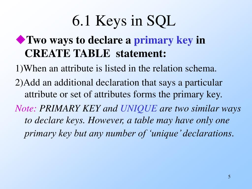 6.1 Keys in SQL • Two ways to declare a primary key in CREATE TABLE statement: 1)When an attribute is listed in the relation schema. 2)Add an additional declaration that says a particular attribute or set of attributes forms the primary key. Note: PRIMARY KEY and UNIQUE are two similar ways to declare keys. However, a table may have only one primary key but any number of ‘unique’ declarations.