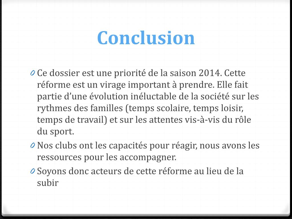 Conclusion • Ce dossier est une priorité de la saison 2014. Cette réforme est un virage important à prendre. Elle fait partie d’une évolution inéluctable de la société sur les rythmes des familles (temps scolaire, temps loisir, temps de travail) et sur les attentes vis-à-vis du rôle du sport. • Nos clubs ont les capacités pour réagir, nous avons les ressources pour les accompagner. • Soyons donc acteurs de cette réforme au lieu de la subir