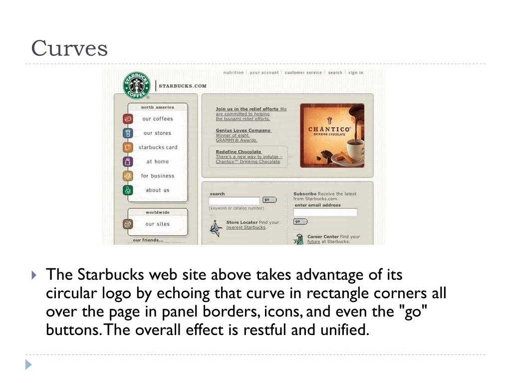 Curves • The Starbucks web site above takes advantage of its circular logo by echoing that curve in rectangle corners all over the page in panel borders, icons, and even the "go" buttons. The overall effect is restful and unified.