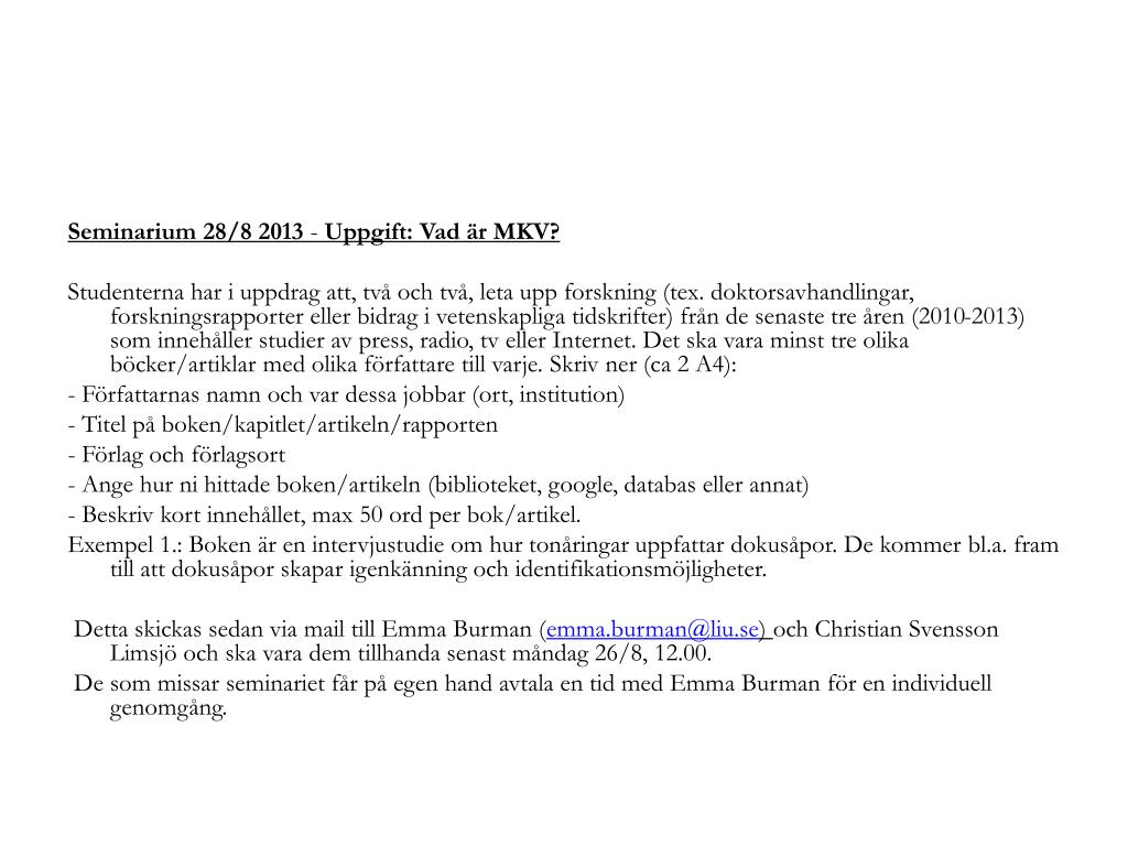Seminarium 28/8 2013 - Uppgift: Vad är MKV? Studenterna har i uppdrag att, två och två, leta upp forskning (tex. doktorsavhandlingar, forskningsrapporter eller bidrag i vetenskapliga tidskrifter) från de senaste tre åren (2010-2013) som innehåller studier av press, radio, tv eller Internet. Det ska vara minst tre olika böcker/artiklar med olika författare till varje. Skriv ner (ca 2 A4): - Författarnas namn och var dessa jobbar (ort, institution) - Titel på boken/kapitlet/artikeln/rapporten - Förlag och förlagsort - Ange hur ni hittade boken/artikeln (biblioteket, google, databas eller annat) - Beskriv kort innehållet, max 50 ord per bok/artikel. Exempel 1.: Boken är en intervjustudie om hur tonåringar uppfattar dokusåpor. De kommer bl.a. fram till att dokusåpor skapar igenkänning och identifikationsmöjligheter. Detta skickas sedan via mail till Emma Burman (emma.burman@liu.se) och Christian Svensson Limsjö och ska vara dem tillhanda senast måndag 26/8, 12.00. De som missar seminariet får på egen hand avtala en tid med Emma Burman för en individuell genomgång.