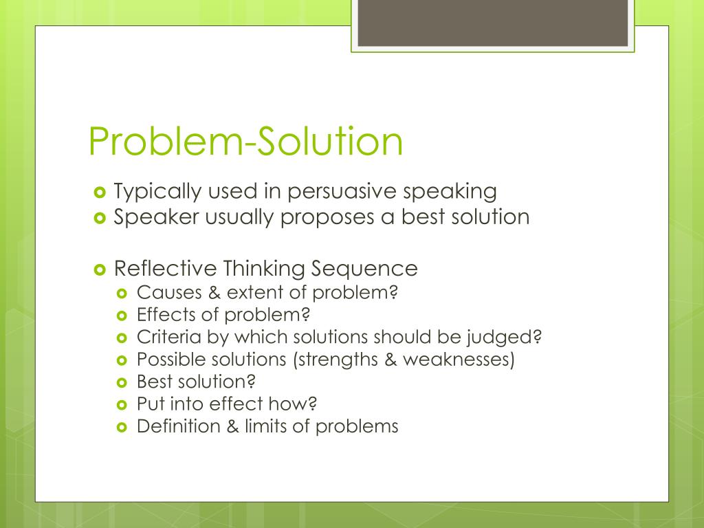 Problem-Solution • Typically used in persuasive speaking • Speaker usually proposes a best solution • Reflective Thinking Sequence • Causes & extent of problem? • Effects of problem? • Criteria by which solutions should be judged? • Possible solutions (strengths & weaknesses) • Best solution? • Put into effect how? • Definition & limits of problems