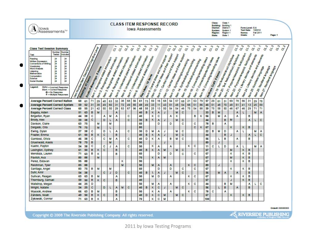Iowa Assessments – Forms E/F • Standards-based instructional decisions • Individual progress and growth for individuals • Reporting group progress and growth • Providing relative comparisons • Providing empirical evidence that supports comparisons with NAEP, state results and international benchmarking measures • Providing information that measures a continuum of achievement and tracks student progress from kindergarten to grade 12. • Measuring achievement in core academic areas important for success in college including reading, language arts, mathematics and science. 2011 by Iowa Testing Programs