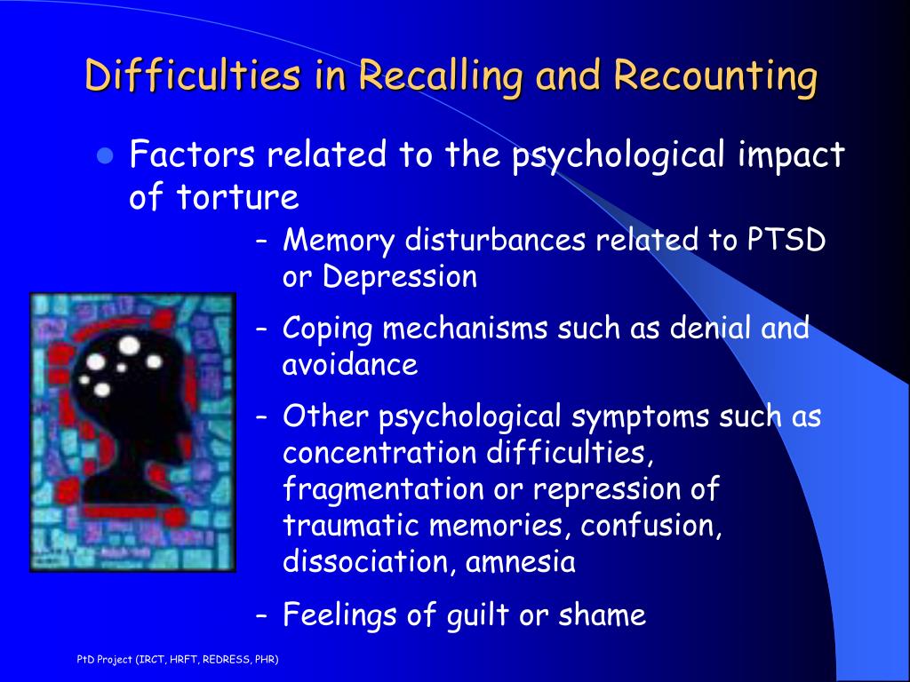 Difficulties in Recalling and Recounting • Factors related to the psychological impact of torture • Memory disturbances related to PTSD or Depression • Coping mechanisms such as denial and avoidance • Other psychological symptoms such as concentration difficulties, fragmentation or repression of traumatic memories, confusion, dissociation, amnesia • Feelings of guilt or shame PtD Project (IRCT, HRFT, REDRESS, PHR)