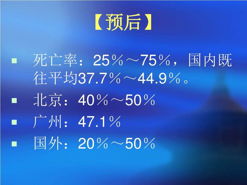 【预后】 • 死亡率:25%~75%,国内既往平均37.7%~44.9%。 • 北京:40%~50% • 广州:47.1% • 国外:20%~50%