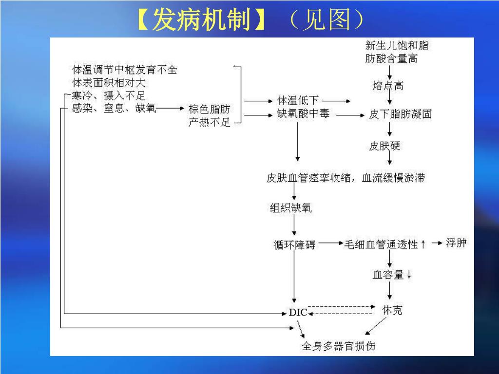 【病因】 • 本病与寒冷、早产缺氧及感染有关。 • 内因 • 1.新生儿体温调节功能尚未发育完全,体表面积相对较大,皮肤薄,血管分布较多,易于散热。 • 2.皮下脂肪少,缺少使饱和脂肪酸变为不饱和脂肪酸的酶。饱和脂肪酸含量高,熔点高,受寒易凝固。 • 3.棕色脂肪代谢产热,但此脂肪储存不足,产热少。